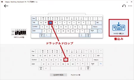 制御キーの割り当てを変更できるDIPスイッチに加えて、「HYBRID Type-S」「HYBRID」「Classic Type-S」は制御キーと文字キー全般(※)のキーマップをカスタマイズできる「キーマップ変更機能」を装備。ソフトウェアによるキーマップ変更は直感的で扱いやすく、設定はHHKB本体に保存されるため、他のデバイスでも同じキーマップで使用できます。